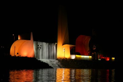 Island White can’t be more than a few hundred yards in diameter. The banks are manmade having been fortified with large slabs of stone. The center of the island has a large derrick standing about 100 ft tall. At all hours industrious noises of grinding and metal working spill out from behind the walls. At night a 30 foot section of one of the walls starts spilling water into the bay from a height of about 15 feet making a waterfall. Lights colored red, yellow, and green light up the whole works. Portions of the walls are over 50 feet high and curve outward looking like a wave about to break. It’s really quite a show at night and we’re sure it’s visible from the beach. We have front row seats of the spectacle. Just a few minutes ago one of those booze cruises went by with music blaring and cameras flashing. Apparently this display is popular with the locals too. There are 3 similar islands within a few miles of our position and visible during daylight. All are employed in oil drilling and share the same design that reminds us of an airport built in the 1970’s. It turns out that the islands are named after astronauts that died while on duty. The other names are Freeman, Chaffee, and Belmont.